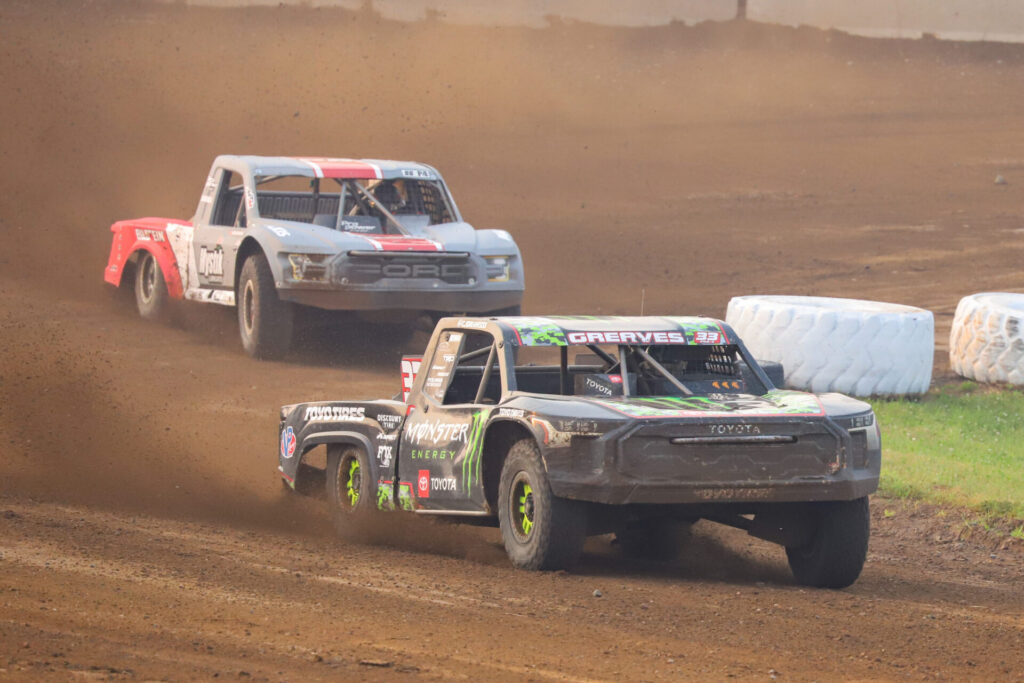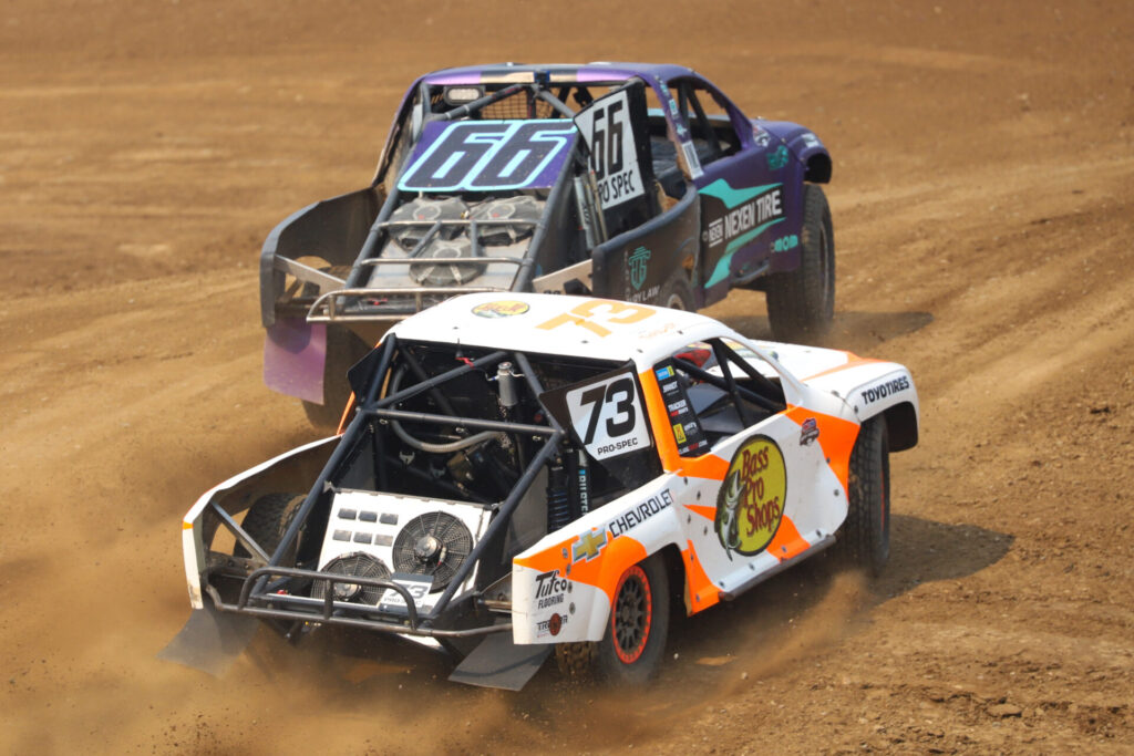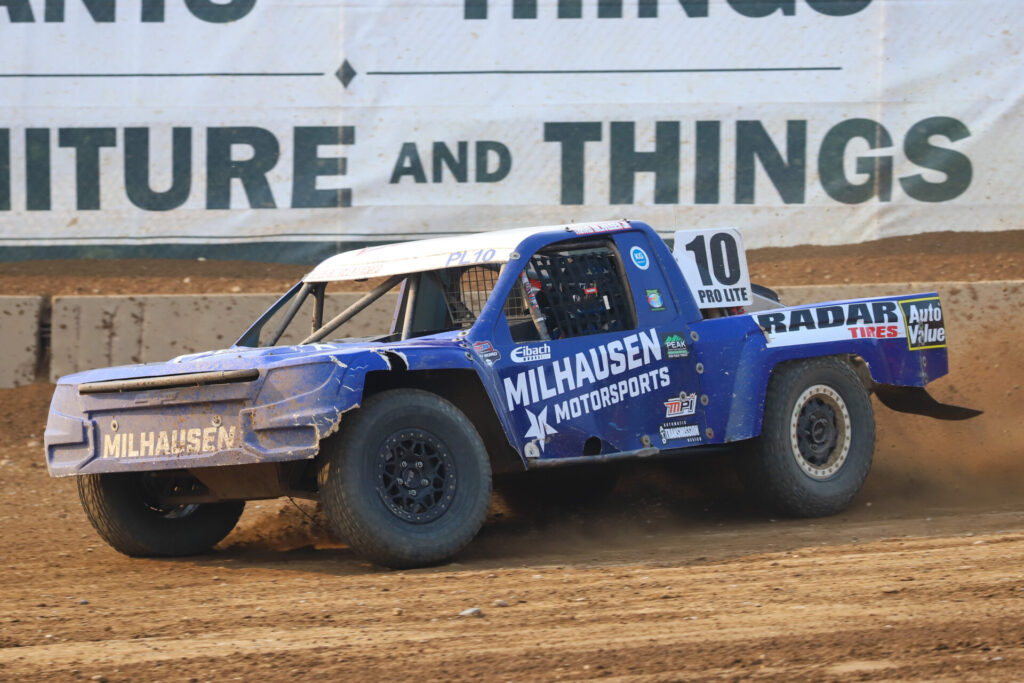 Johnny Holtger has been the class of Pro Lite this season, racking up four wins and proving tough to beat. He looked unstoppable again early on Saturday, leading the field while fastest qualifier Travis Milhausen, Jr. stalked him from second. The mandatory caution tightened the pack, and Milhausen capitalized on the opportunity. After pressuring Holtger for a lap, Holtger put his truck up on two wheels, allowing Milhausen to slip underneath and take the lead.
